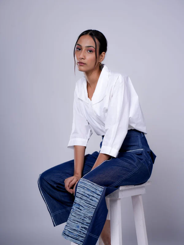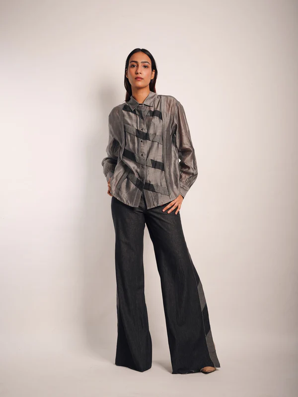 grey inverted u shirt and white pleated pants set